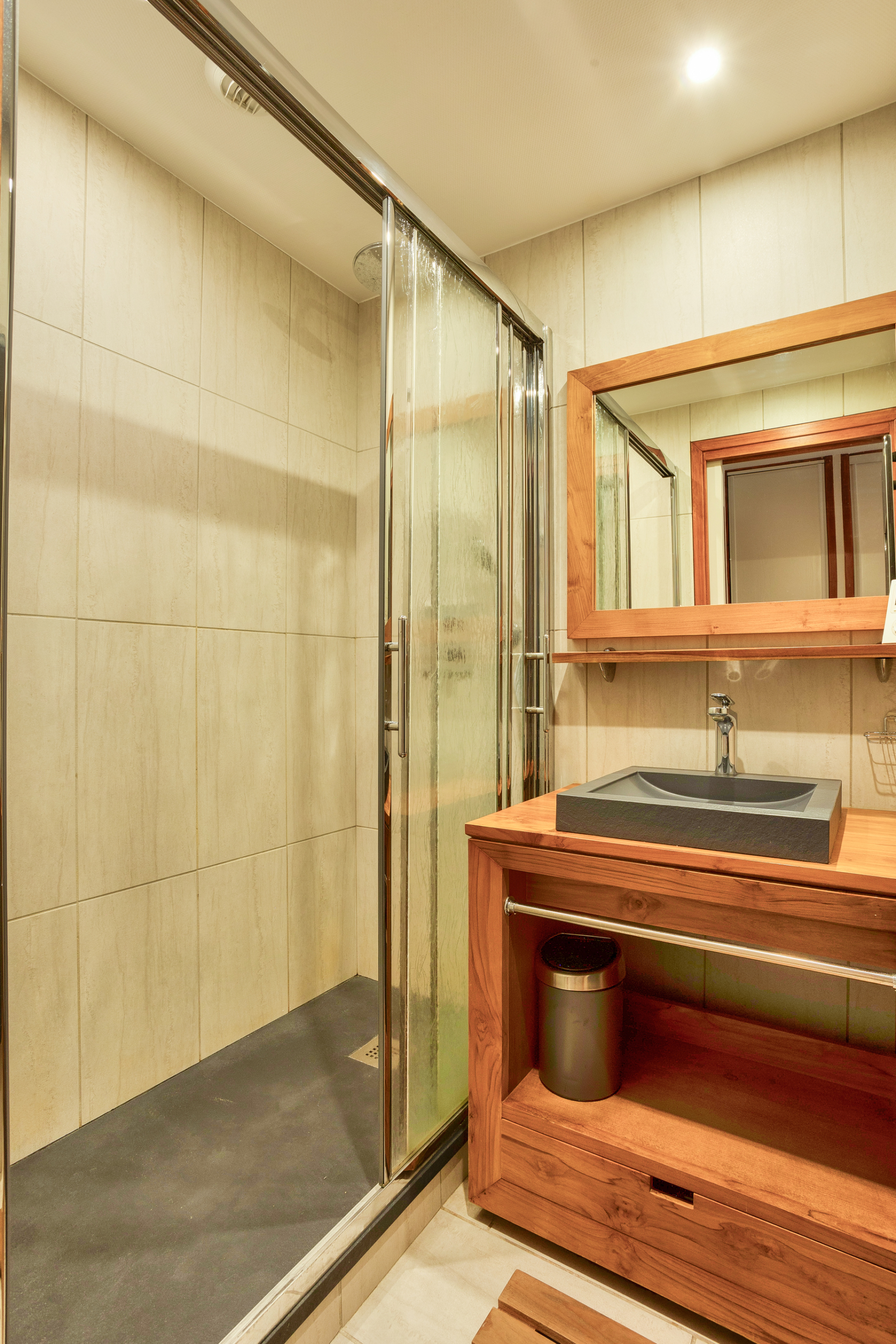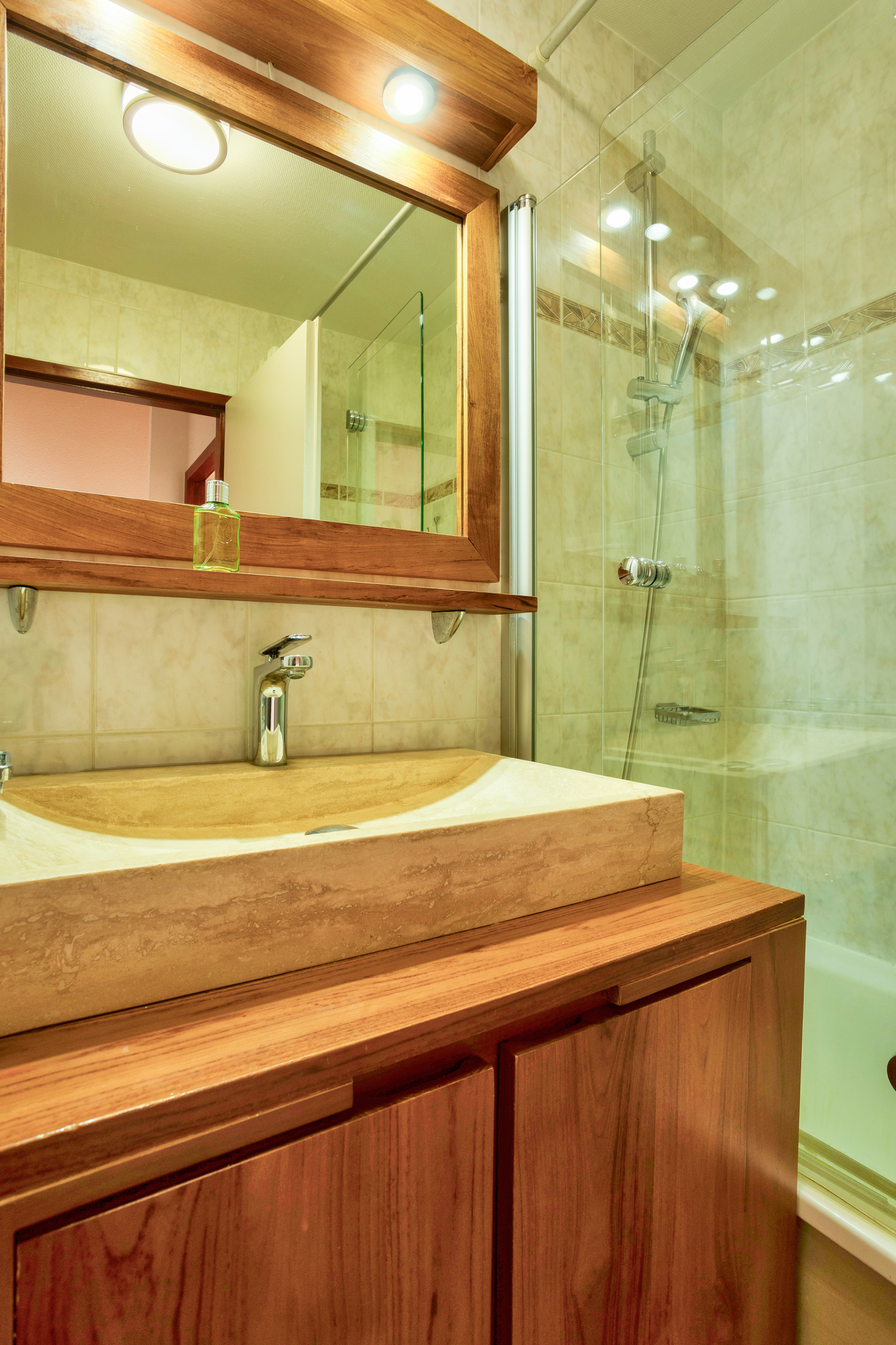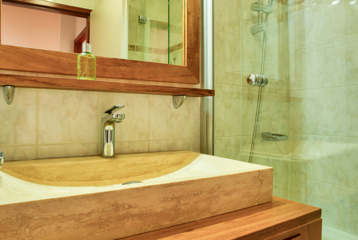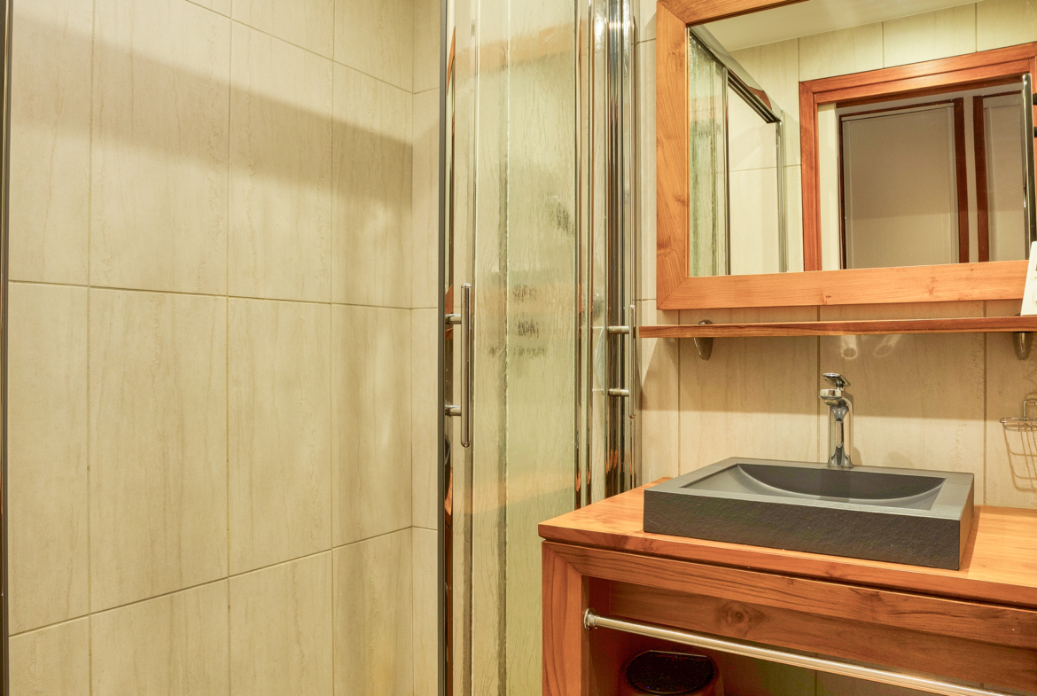 Sanitaires : Un WC indépendant à chaque niveau (dont 1 avec lave-main). A l’étage salle de bains avec baignoire (pare-douche) et sèche-serviette. Une salle d’eau avec grande douche, lavabo et sèche-serviette. Mitigeurs thermostatiques. Lave-linge et sèche-linge à l’étage.