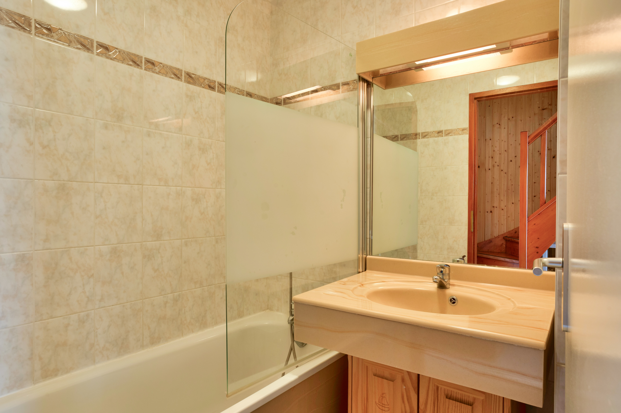 Sanitaires : Salle de bain avec baignoire (pare-baignoire) et lavabo. WC séparés. A l’étage, une salle de douche avec lavabo et WC.