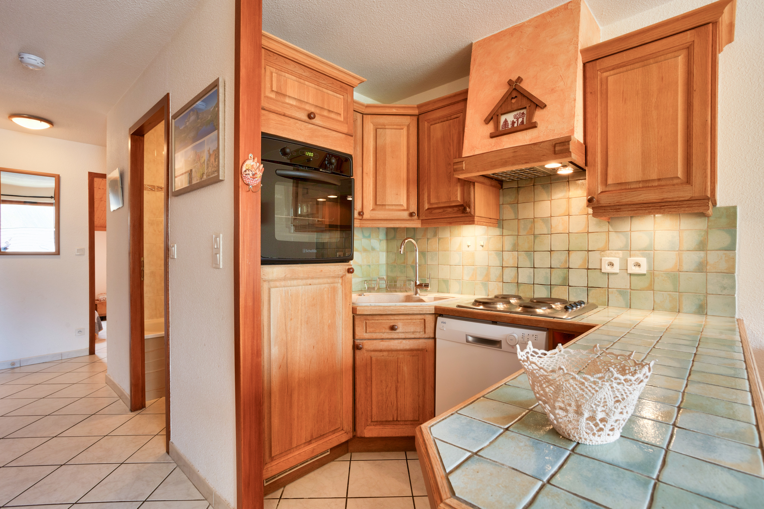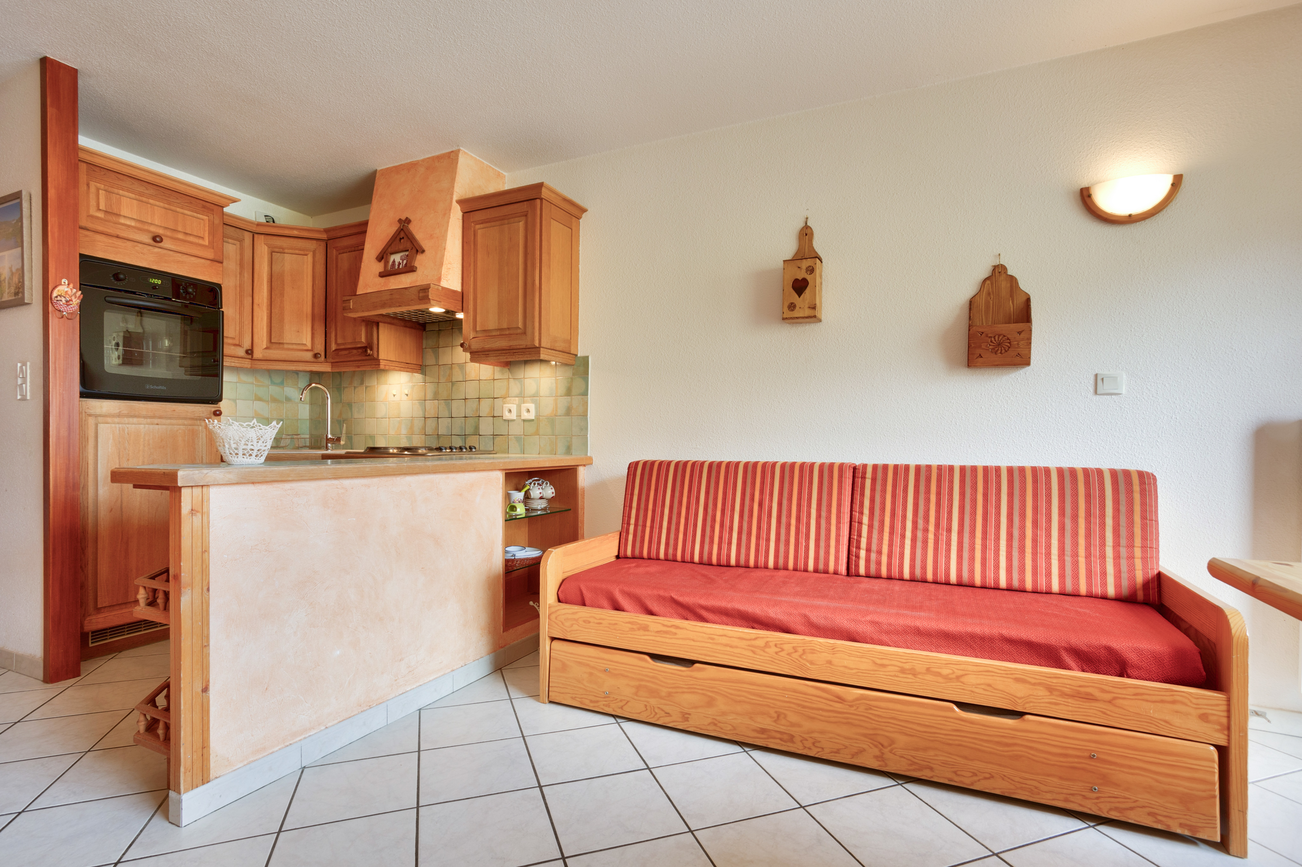 Equipements : Séjour avec coin cuisine équipé (four, micro-ondes, réfrigérateur, lave-vaisselle, plaques électriques, hotte aspirante) et coin salon avec TV. Connexion wifi gratuite.