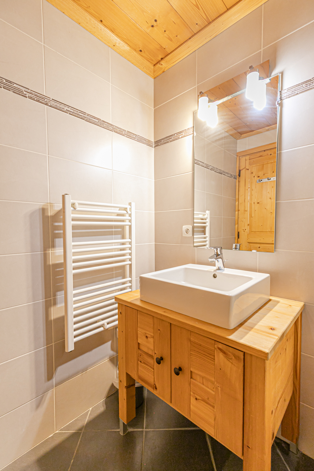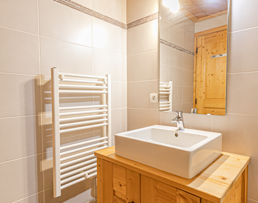 Sanitaires : Salle de bain avec baignoire (pare-douche), lavabo et sèche-serviette. WC séparés.