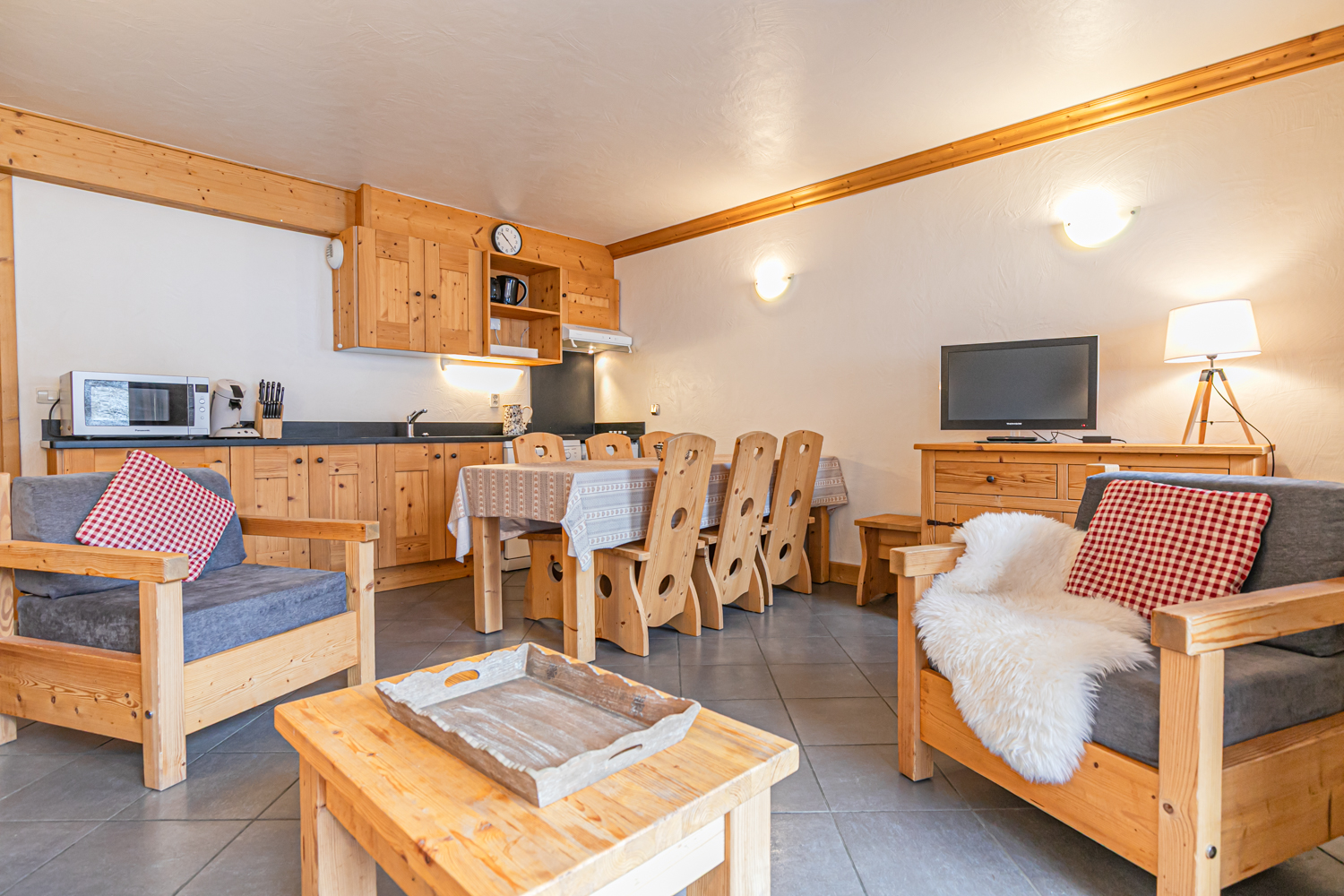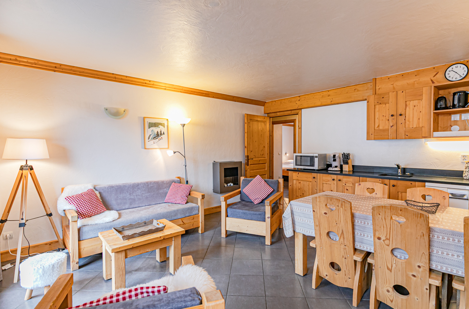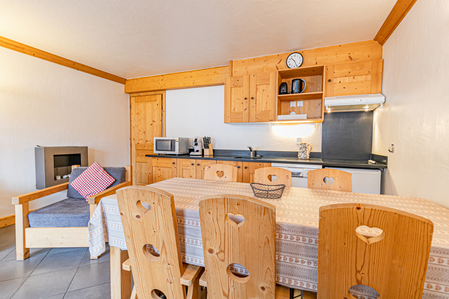Equipements : Coin cuisine équipé (plaques vitrocéramiques, four combiné micro-ondes, lave-vaisselle, réfrigérateur). Coin salon avec canapé, TV écran plat et cheminée à l’éthanol. Connexion WIFI.