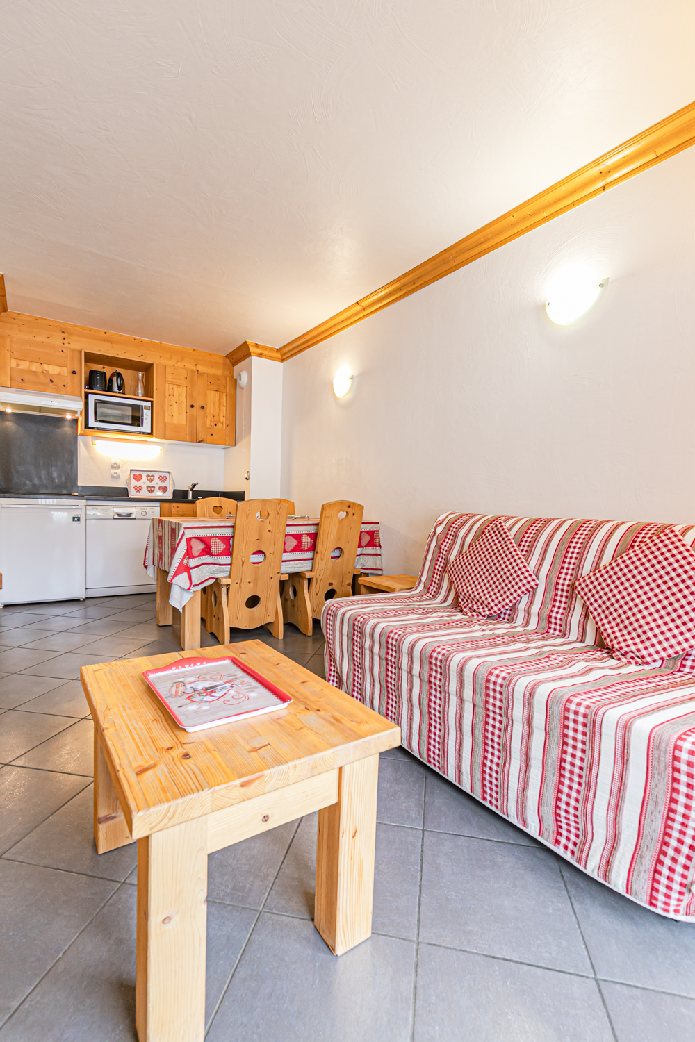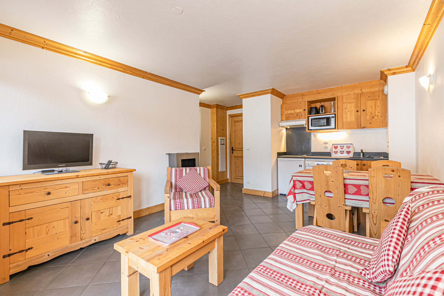 Equipements : Coin cuisine équipé (plaques vitrocéramiques, four combiné micro-ondes, lave-vaisselle, réfrigérateur). Coin salon avec TV écran plat et cheminée à l’éthanol. Connexion WIFI.