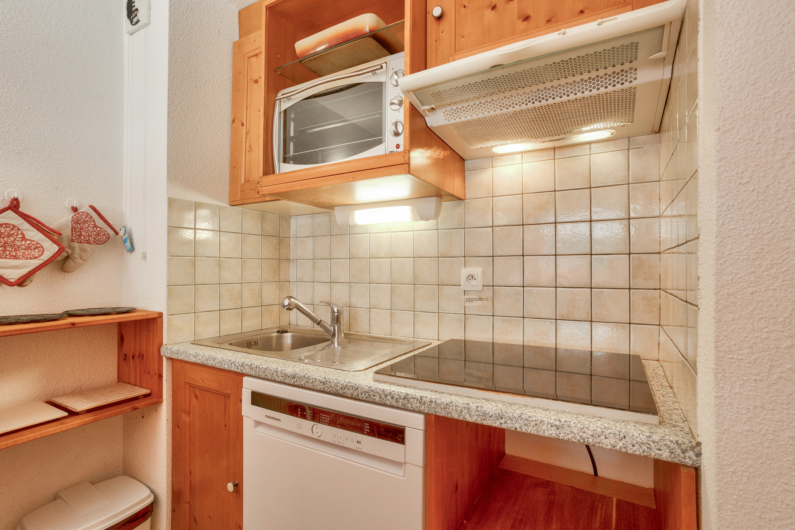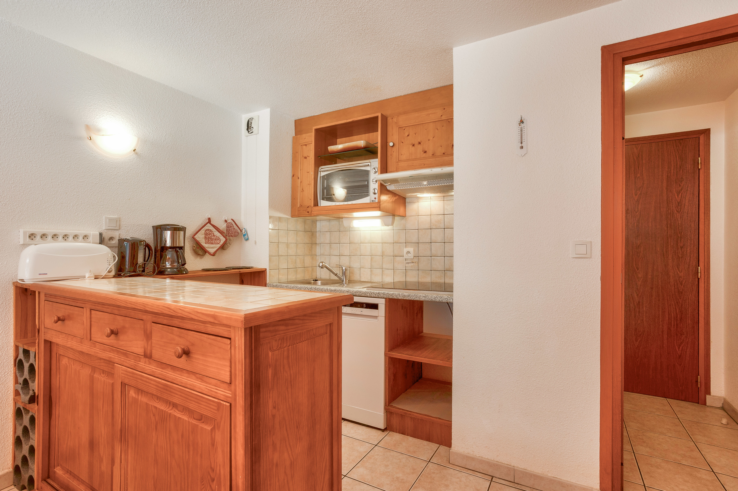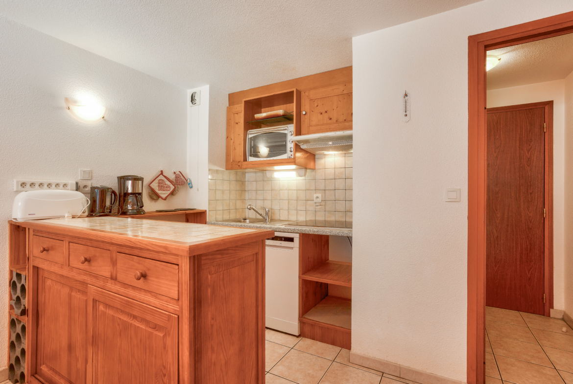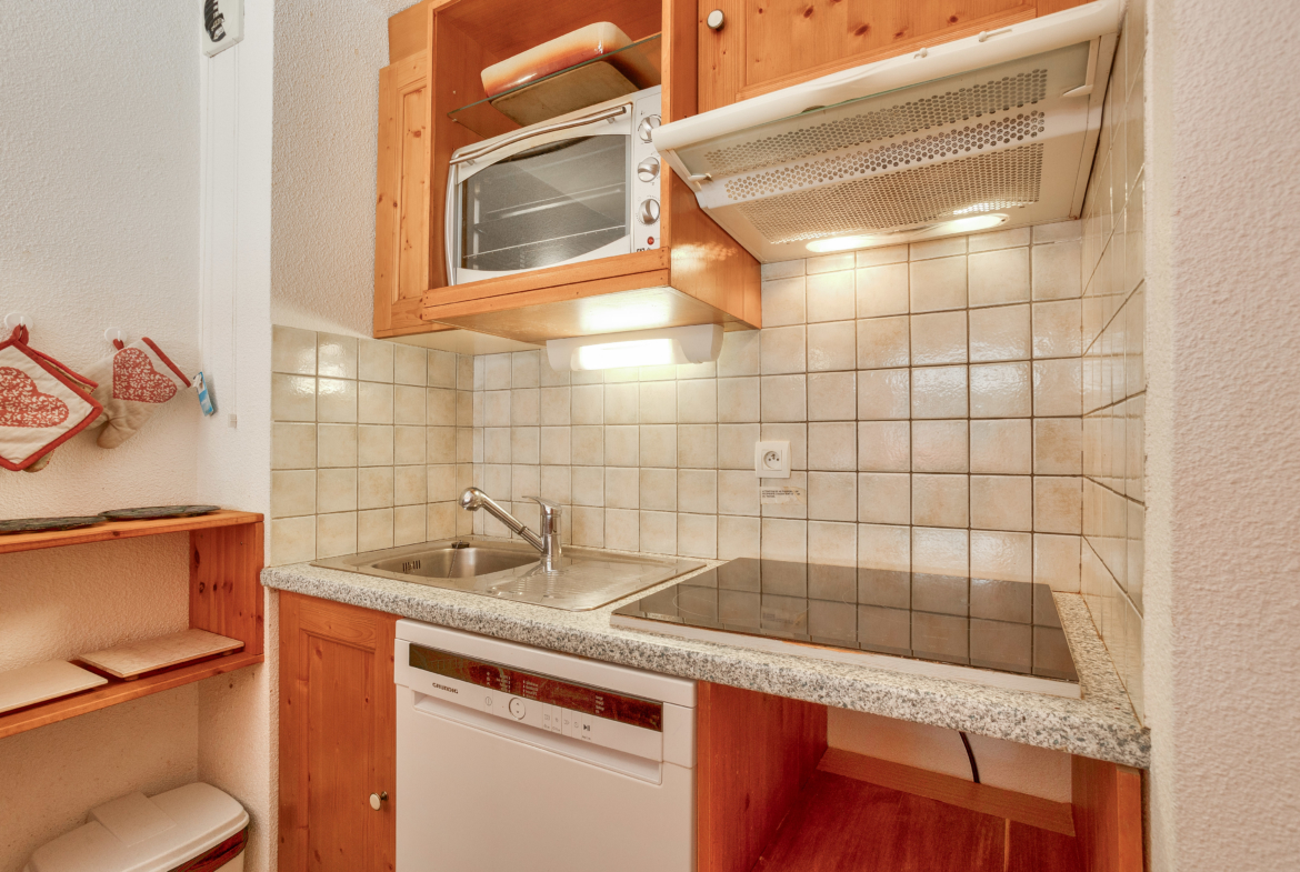 Séjour avec coin cuisine équipé (mini-four, micro-ondes, réfrigérateur, lave-vaisselle, plaques électriques, hotte aspirante) et coin salon avec TV et lecteur DVD.